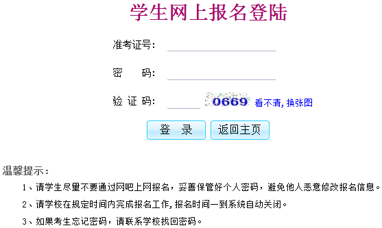1、请学生尽量不要通过网吧上网报名,妥善保管好个人密码,避免他人恶意修改报名信息。