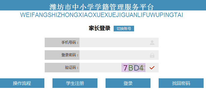 潍坊市中小学学籍管理服务平台123.133.71.101:9001/business 学习吧(24-01-22) 潍坊市中小学学籍管理服务平台http://218.59.136.120/ http://123.133.71.101:9001/business_handle/user/gotoLogin.action?flag=1潍坊市中小学学籍管理服务平台 正在处理,请稍候…… 潍坊市中小学学籍管理服务平台 家长登录 切换账号 手机号码:登录密码:验证码:操作流程 学生注册 登录 找回密码