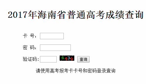 海南省高考成绩查询 一起来学习(24-01-22) 一起学习吧小编整理编辑了2017年海南普通高考考生成绩查询入口http://www.hnks.gov.cn/chengji/gkcj/ 成绩查询程序 卡号: 密码: 验证码: 2017年海南省高考成绩查询入口http://www.hnks.gov.cn/chengji/gkcj/