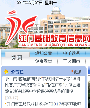 江门公办幼儿园报名入口jm.edugd.cn江门基础教育信息网 学习吧(24-01-22) http://jm.edugd.cn/江门基础教育信息网 家长需登录江门基础教育信息网(http://jm.edugd.cn/)进入2017年秋季幼儿园报名系统,填写相关资料进行报名。需要提醒的是,三所幼儿园招生同时进行,每名适龄幼儿只能选择其中一所幼儿园报名。 今年秋季,江门市第一幼儿园、江门市教育第一幼儿园和培英实验幼儿园3所公办幼儿园网上报名即将开始啦!报名时间为3月30日至4月16日,过期截止。