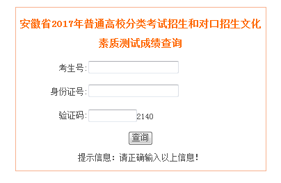 cx.ahzsks.cn录取结果 成绩录取结果查询 学习吧(24-01-22) 安徽省教育招生考试院:http://cx.ahzsks.cn/ 普通高校分类考试招生和对口招生文化素质测试成绩查询cx.ahzsks.cn 安徽省2017年普通高校分类考试招生和对口招生文化素质测试成绩查询 安徽省2017年普通高校分类考试招生和对口招生文化素质测试成绩查询考生号:身份证号:验证码:2140 提示信息:请正确输入以上信息!安徽省教育招生考试院 版权所有