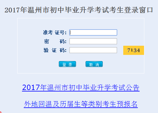 zk.wzer.net温州初中毕业升学考试报名 学习吧(24-01-22) 温州初中毕业升学考试报名zk.wzer.net 2017年温州市初中毕业升学考试考生登录窗口http://zk.wzer.net/wzzk/login/login.jsp 2017年温州市初中毕业升学考试考生登录窗口 准考 证号: 密 码: 验 证 码: 登 录 取 消 2017年温州市初中毕业升学考试公告 外地回温及历届生等类别考生预报名