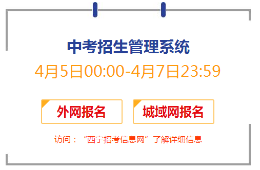 www.xnjyj.gov.cn西宁中考招生报名系统 学习吧(24-01-22) 西宁中考招生管理系统http://www.xnjyj.gov.cn/ 西宁教育网 中考招生管理系统 4月5日00:00-4月7日23:59 外网报名 城域网报名 访问:“西宁招考信息网”了解详细信息 版权所有:西宁市教育局青ICP备0500144212技术支持:西宁市教育信息中心