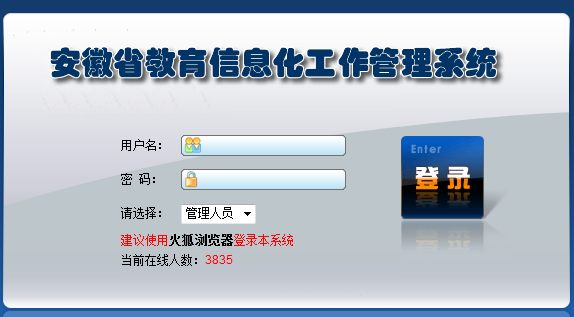 安徽省教育信息化工作管理系统36.7.69.141:9991/jyxxh/login.asp 学习吧(24-01-22) 安徽省教育信息化工作管理系统http://36.7.69.141:9991/jyxxh/login.aspx?nextpage=index.aspx 安徽省教育信息化工作管理系统36.7.69.141:9991/jyxxh/login.aspx 用户名: 密 码: 请选择: 管理人员 学校用户 建议使用火狐浏览器登录本系统 当前在线人数:3835 1,20151126调整后培训会PPT下载 2,交流QQ群:413902563(地市、县区管理员)