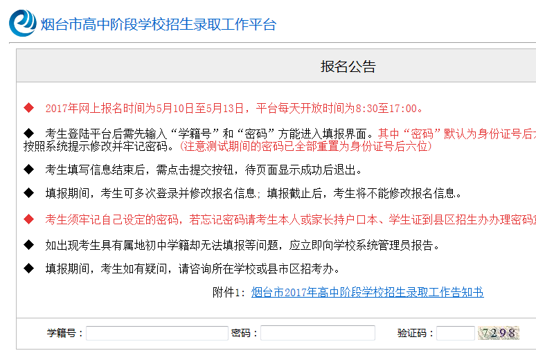 烟台市2017年高中阶段学校招生录取采用网上填报志愿、网上录取方式。考生在填报志愿前应认真阅读本告知书。