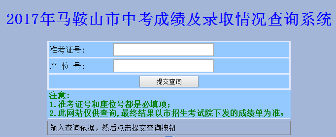 www.maseea.cn:8080/zhongk/马鞍山市中考成绩及录取情况查询系统 学习吧(24-01-22) 2017年马鞍山市中考成绩及录取情况查询系统http;//www.maseea.cn:8080/zhongk/ 准考证号: http://www.ajrhws.com/ah/chengji/21918.html 座 位 号: 提交查询 注意:www.maseea.cn:8080/zhongk/马鞍山市中考成绩及录取情况查询系统 1.准考证号和座位号都是必填项; 2.此网站仅供查询,最终结果以市招生考试院下发的成绩单为准; 输入查询依据,然后点击提交查询按钮