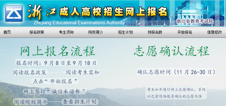 2018年浙江成人高校招生网上报名(网上报名:9月8日--9月18日)(现场确认:9月19日-9月23日)