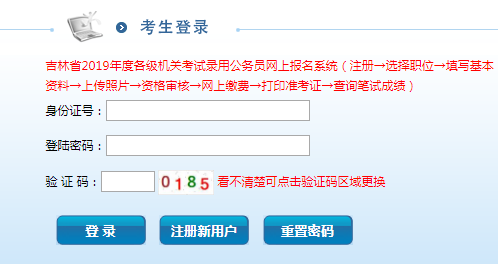 吉林省公务员考试网上报名系统www.jlgwyks.cn 学习吧(24-01-22) 2019吉林省公务员考试网上报名系统www.jlgwyks.cn 吉林省2019年度各级机关考试录用公务员网上报名系统(注册→选择职位→填写基本资料→上传照片→资 格审核→网上缴费→打印准考证→查询笔试成绩)http://www.jlgwyks.cn/cxxy.aspx?id=560 进入报名开始时间:2019-03-07 结束时间:2019-05-30 吉林省2019年度公开遴选(选调)公务员职位与条件网上申报系统http://www.ajrhws.com/jl/33448.html