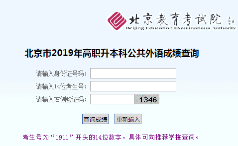 北京高职升本科外语课成绩查询系统http://222.249.128.21/zsbcjcx/index1.htm 学习吧(24-01-22) 北京高职升本科外语课成绩查询系统http://222.249.128.21/zsbcjcx/index1.htm 北京市高职升本科公共外语成绩查询 请输入身份证号码: 请输入14位考生号: 请输入右侧验证码: 考生号为“1911”开头的14位数字,具体可向推荐学校查询。 北京高职升本科外语课成绩查询系统http://222.249.128.21/zsbcjcx/index1.htm