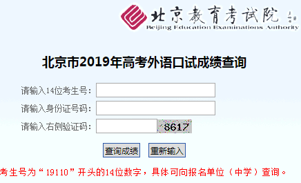 北京市高考外语口试成绩查询系统 学习吧(24-01-22) 北京市高考外语口试成绩查询系统http:222.249.128.21/wykszkz2019/index-cj.htm 北京市2019年高考外语口试成绩查询 请输入14位考生号: 请输入身份证号码: 请输入右侧验证码: 考生号为“19110”开头的14位数字,具体可向报名单位(中学)查询。