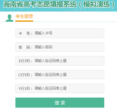 http;//ea.hainan.gov.cn海南省高考志愿填报系统入口 学习吧(24-01-22) http;//ea.hainan.gov.cn海南省高考志愿填报系统入口 海南省高考志愿填报系统(模拟演练) 考生登录 卡 号: 请输入卡号 密 码: 请输入密码 E行3列: 请输入验证码表上值 C行5列: 请输入验证码表上值 F行1列: 请输入验证码表上值 登 录 站长统计 | 友情链接 版权所有:海南省考试局
