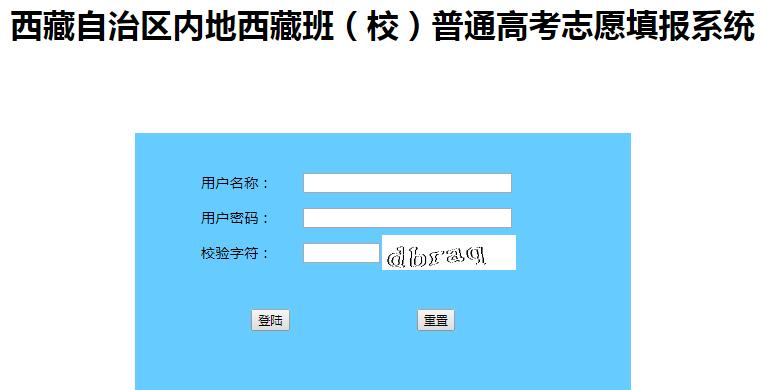 http://220.182.46.131:8002/西藏自治区内地普通高考志愿填报系统 学习吧(24-01-22) http://220.182.46.131:8002/西藏自治区内地普通高考志愿填报系统 http://220.182.46.131:8002/index.html西藏自治区内地西藏班(校)普通高考志愿填报系统 用户名称: 用户密码: 校验字符: 西藏自治区内地西藏班(校)普通高考志愿填报系统版权所有:西藏自治区教育考试院 http://220.182.46.131:8002/西藏自治区内地普通高考志愿填报系统