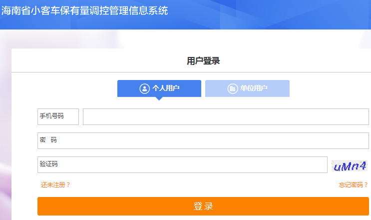 www.hnjdctk.gov.cn/海南省小客车保有量调控管理信息系统 一起学习吧(24-01-22) www.hnjdctk.gov.cn/海南省小客车保有量调控管理信息系统 用户登录 个人用户 单位用户 手机号码 密 码 验证码 还未注册? 忘记密码? 登 录www.hnjdctk.gov.cn/海南省小客车保有量调控管理信息系统