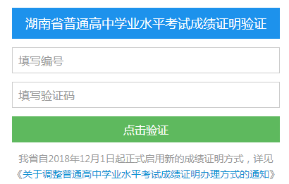 湖南省普通高中学业水平考试成绩证明验证https://xk.hneao.cn/score/ 学习吧(24-01-22) 湖南省普通高中学业水平考试成绩证明验证https://xk.hneao.cn/score/ 湖南省普通高中学业水平考试成绩证明验证 填写编号 填写验证码 点击验证 我省自2018年12月1日起正式启用新的成绩证明方式,详见 《关于调整普通高中学业水平考试成绩证明办理方式的通知》 (湘教考通〔2018〕41号) [ 成绩证明样张 ] [ 下载打印和验证流程 ]
