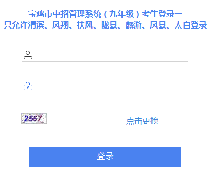 宝鸡市中招管理系统(九年级)考生登录一 考生登录二 毕业学校登录 招生学校登录 考点用户登录 管理员登录 宝鸡市中招管理系统(九年级)考生登录一