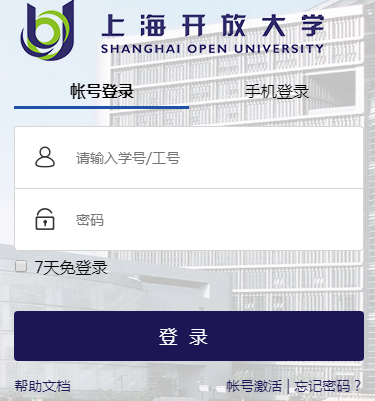 http://myportal.shou.org.cn上海开放大学统一身份认证平台 学习吧(24-01-22) 一起学习吧小编整理分享以下学校教务系统网址入口:http://myportal.shou.org.cn上海开放大学统一身份认证平台 微信扫码登录 帐号登录手机登录 请输入学号/工号 密码 7天免登录 登录 帮助文档忘记密码? | 帐号激活 温馨提示:http://www.ajrhws.com/jwc/56947.html 1. 学生登录为学号,教师登录为工号。 2. 初次登录请激活,并修改密码。 上海开放大学统一身份认证平台