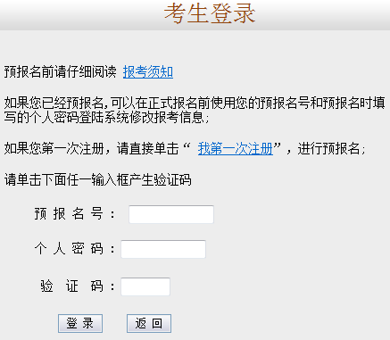 如果您已经预报名,可以在正式报名前使用您的预报名号和预报名时填写的个人密码登陆系统修改报考信息;