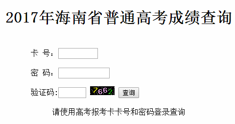 海南普通高考成绩查询www.hnks.gov.cn/chengji/gkcj/ 学习吧(24-01-22) 2017年海南省普通高考成绩查询http://www.hnks.gov.cn/chengji/gkcj/ 卡 号: 密 码: 验证码: 查询http://www.hnks.gov.cn/chengji/gkcj/海南高考成绩查询 请使用高考报考卡卡号和密码登录查询d.ajrhws.com 预祝大家取得好成绩!