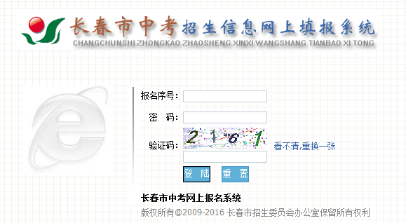 长春中考招生报名入口 学习吧(24-01-22) 吉林长春初三中考报名系统入口: 长春市中考招生信息网上填报系统http://122.139.2.244:8888/kaosheng/login.aspx 报名序号: 密 码: 验证码: 看不清,重换一张 长春市中考网上报名系统 版权所有@2009-2016 长春市招生委员会办公室保留所有权利