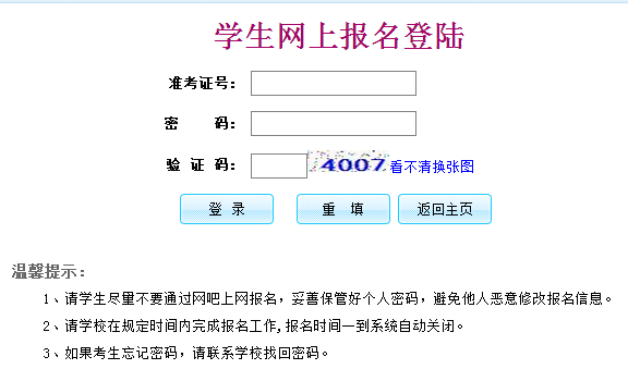 惠州中考报名系统入口zkbm.hzkszx.com/Default.aspx 学习吧(24-01-22) 2017惠州中考报名系统入口zkbm.hzkszx.com/Default.aspx 惠州招考网学生网上报名登陆 准考证号: 密 码: 验 证 码: 看不清,换张图看不清换张图 登 录 重 填 返回主页 温馨提示: 1、请学生尽量不要通过网吧上网报名,妥善保管好个人密码,避免他人恶意修改报名信息。 2、请学校在规定时间内完成报名工作,报名时间一到系统自动关闭。 3、如果考生忘记密码,请联系学校找回密码。